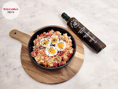 Pełnowartościowe danie z jajami ugotowanymi na twardo, mieszanką warzyw, kiszoną kapustą, ketchupem…
