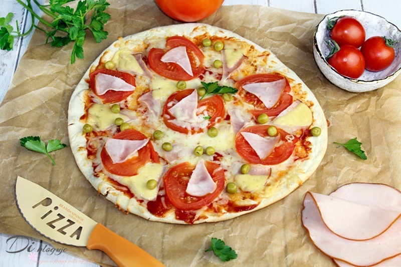Pizza zero waste z szynką, pomidorami i zielonym groszkiem