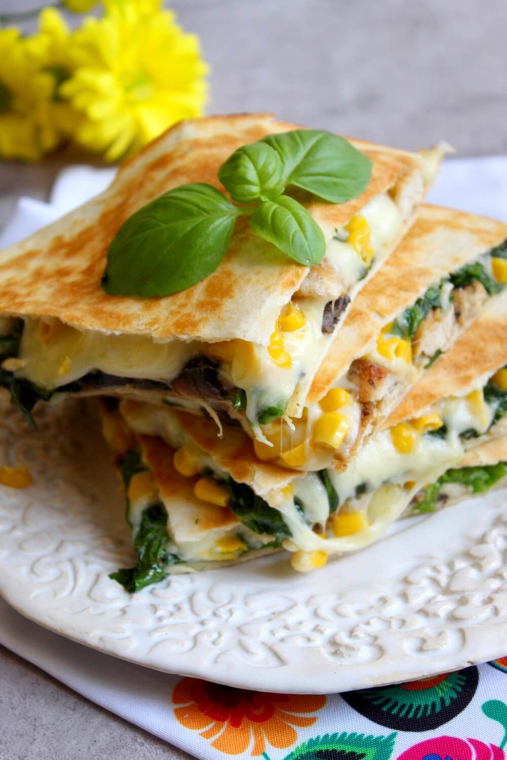 Quesadilla z kurczakiem, pieczarkami i kukurydzą Quesadilla to popularne danie kuchni meksykańskiej…