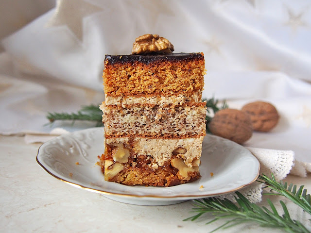 To ciasto idealne dla tych, których cierpią na nadmiar orzechów, a z tego co widziałam na facebooku takich osób jest mnóstwo. Mamy tutaj orzechy zapiekane na cieście miodowym, biszkopt orzechowy oraz krem z dodatkiem orzechów w sumie ponad pół kilograma orzechów w jednym cieście. Pyszne, efektowne i dzięki