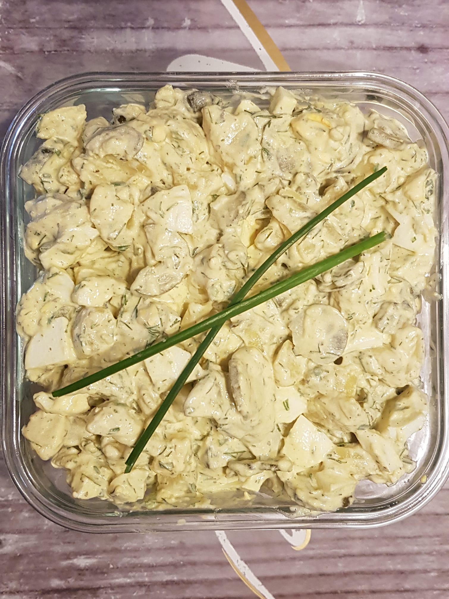 ziemniaki gotowane – 8 szt.ogórki kiszone – 4 szt.jajka na twardo – 5 szt.ząbek czosnkumajonez – 2 łyżkiśmietana 18% – 1 łyżkałyżeczka musztardypęczek koperkupęczek szczypiorkułyżeczka ziół prowansalskich