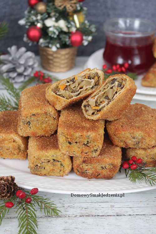 Kapustę odciskamy z nadmiaru soku, kroimy i wkładamy do garnka. Pieczarki kroimy w kosteczkę lub ścieramy na tarce o grubych oczkach, przekładamy na patelnię, doprawiamy solą oraz pieprzem