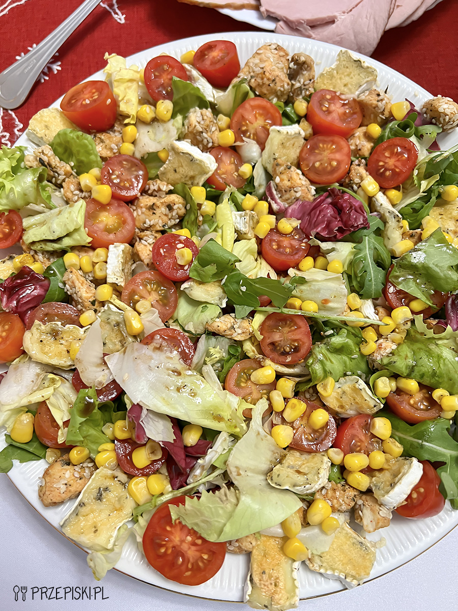 Sałatka na poczęstunek to bardzo lekka sałatka z kurczakiem, serem camembert oraz innymi kolorowymi warzywami. Dodatek do sałatki to lekki i delikatny sos