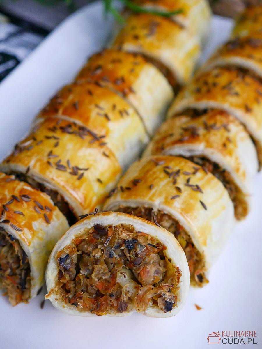 Kapuśniaczki z ciasta francuskiego, nadziane pysznym farszem z kapusty i grzybów. Wyśmienita przekąska na imprezę!