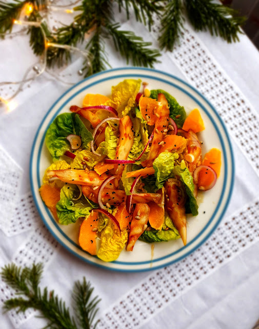 Sałatka z grillowaną gruszką i pomarańczą.Pyszna sałatka dodająca energii z gruszką, pomarańczą, czerwoną cebulą i olejem z czarnego sezamu.
