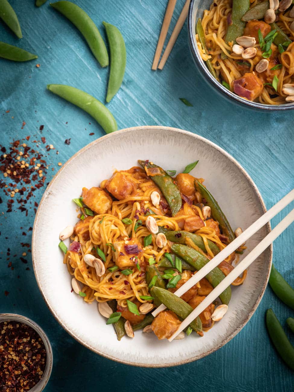 Po tym jak ogromny sukces na blogu odniosło tofu w sosie pomarańczowym podane z ryżem i brokułami, postanowiłem ukręcić kolejne danie z tofu w roli głównej. Tym razem postawiłem na twarzyszący mu sos orzechowy, którego jestem wielkim fanem oraz azjatycki makaron dla lekkiego urozmaicenia.