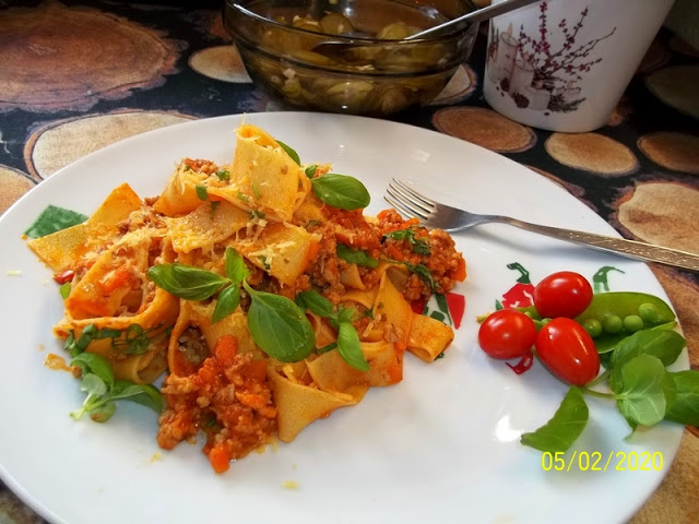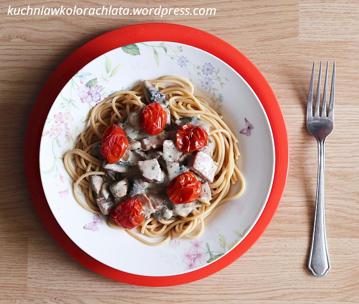 Witajcie! Mam dla Was pomysł na szybki obiad z makaronem, polanym sosem z szynka i pieczarkami. Podajcie go koniecznie z pieczonymi pomidorkami!