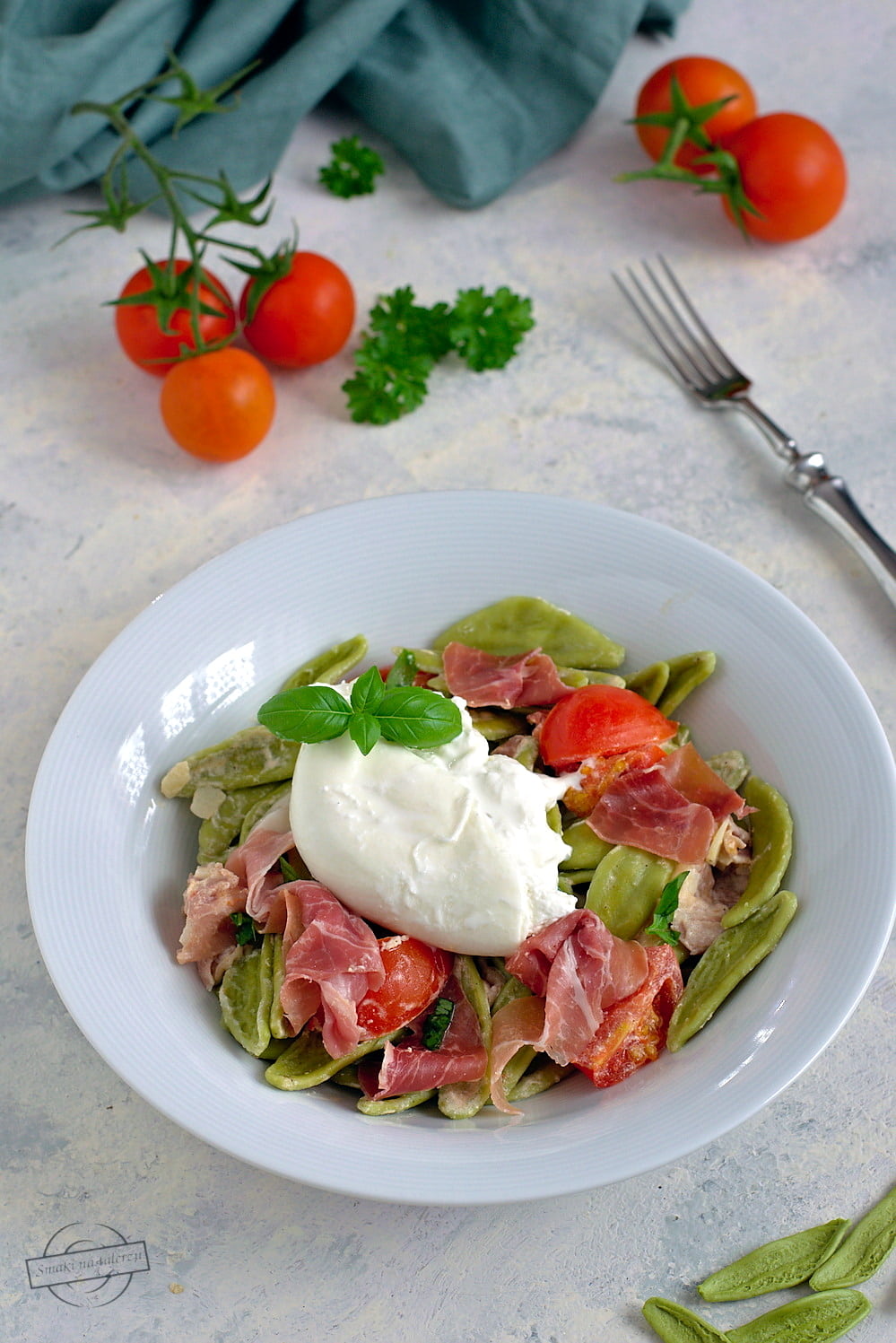 Makaron z burratą i prosciutto