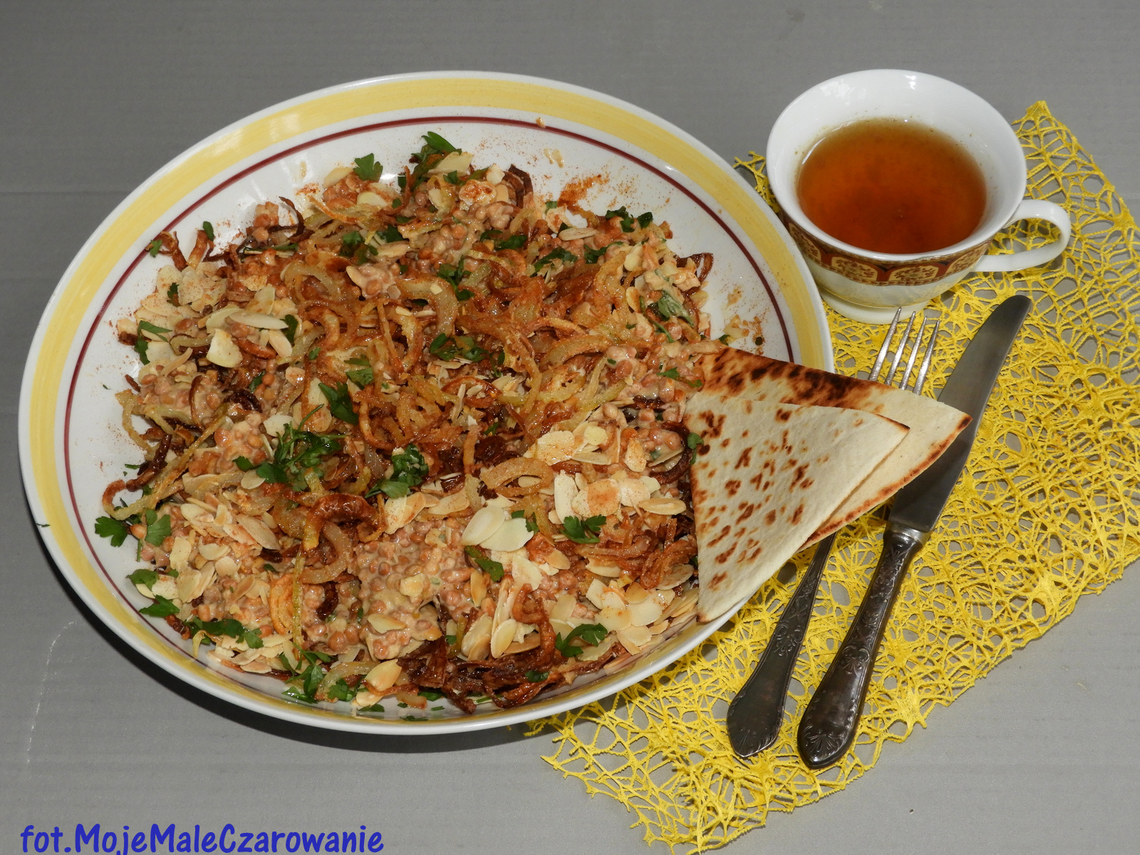 Autorzy książki „Palestyna” Sami Tamimi i Tara Wigley napisali że danie to jest uzależniające i ja te słowa potwierdzam.Kremowa ale lekko jeszcze chrupiąca soczewica, migdały i tahini, to już brzmi znakomicie ale jeszcze jest smażona, chrupiąca cebulka, bardzo aromatyczna. Danie jest petardą i choć jego przeznaczenie jest jako dodatek do mięs
