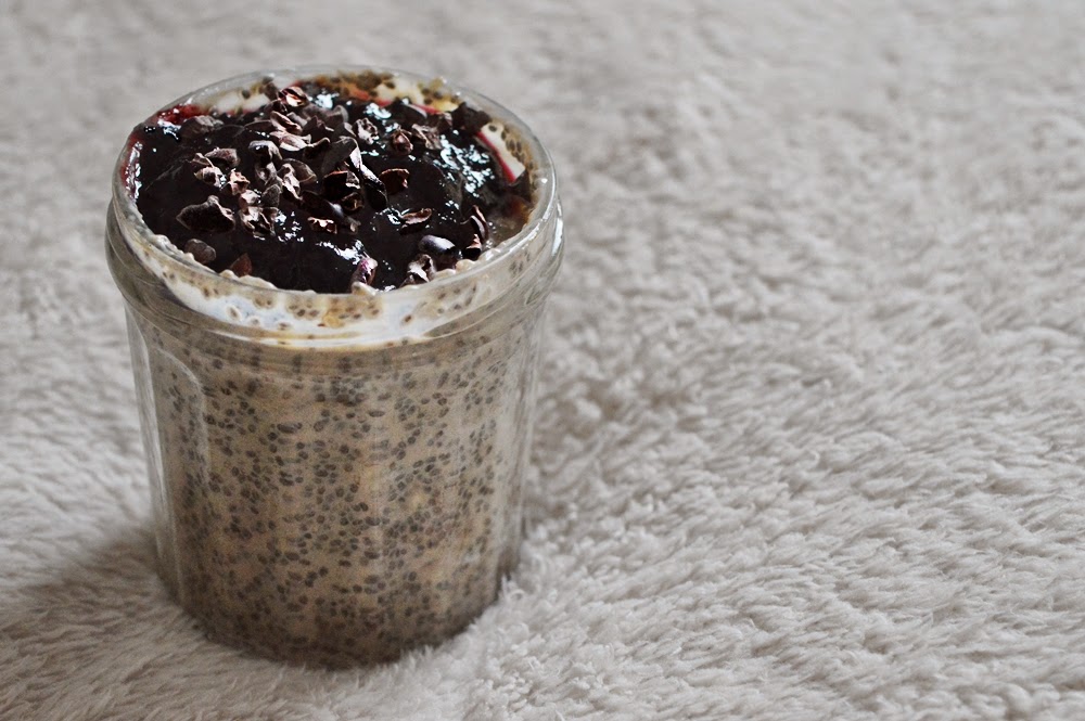 karobowo-bananowy pudding chia na czekoladowej maślance, z dżemem jagodowym i surowym kakao…