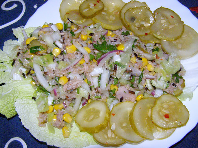 Składniki: ryż basmati 2 woreczki ugotowane 200 gram, cebula biała 1 mniejsza, cebula czerwona 1 mniejsza, ogórek kiszony 1 średni, kukurydza 1 puszka mała, natka pietruszki 1/2 pęczka, pieprz mielony 3/4 łyżeczki, sól 1/2 łyżeczki, tuńczyk w oleju 2 puszki, kapusta pekińska 1/2 główki lub 1 mała