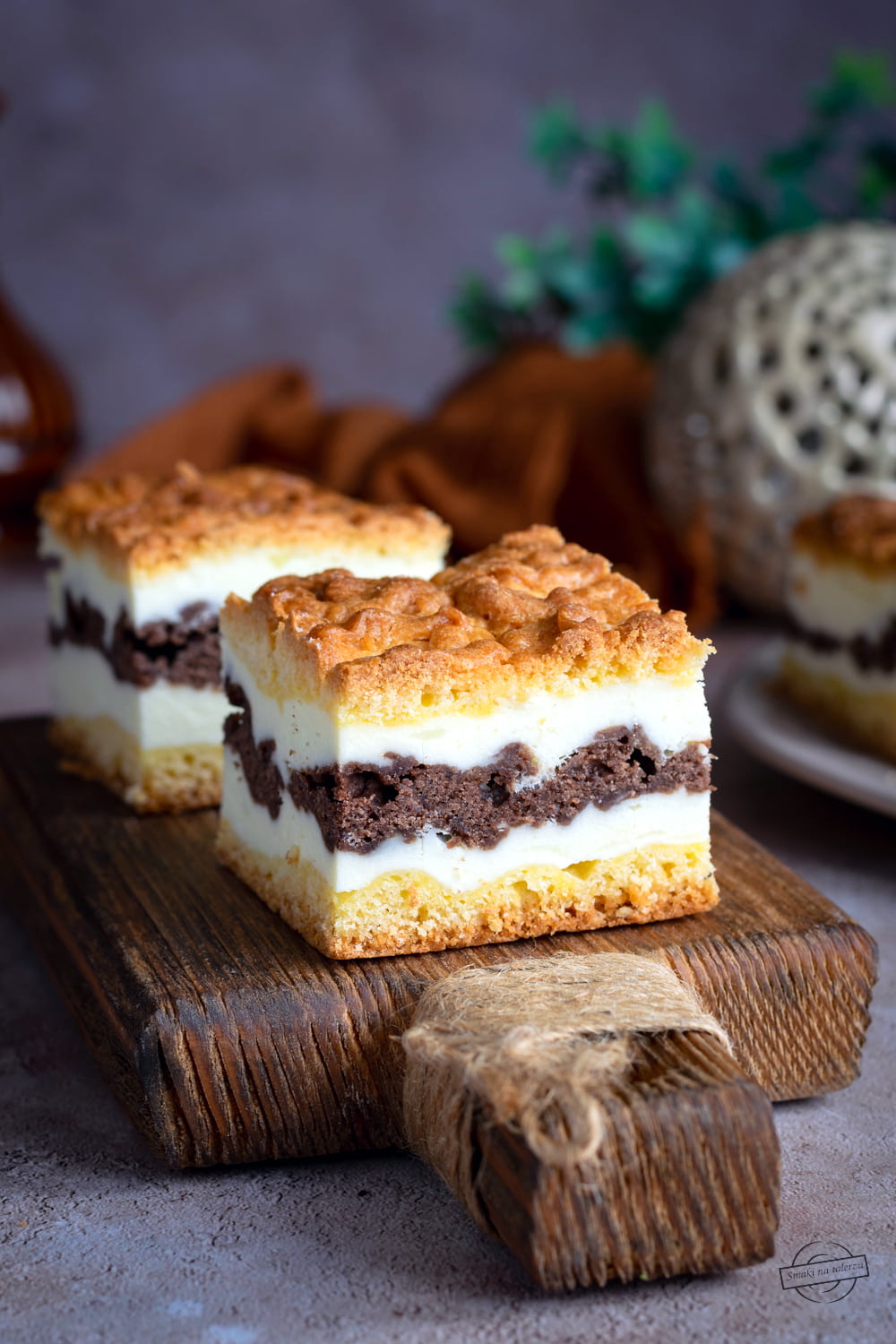 Sernik inspirowany tym z przepisu siostry Anastazji (sernik kolorowy). Jak tylko go spróbowałam od razu skojarzyły mi się ciasta na kwaśnej śmietanie i białkach (brzoskwiniowiec z budyniową pianką oraz ciasto z pianką budyniową). Tamte ciasta co prawda NIE zawierają twarogu, ale i tak smakiem są do siebie na