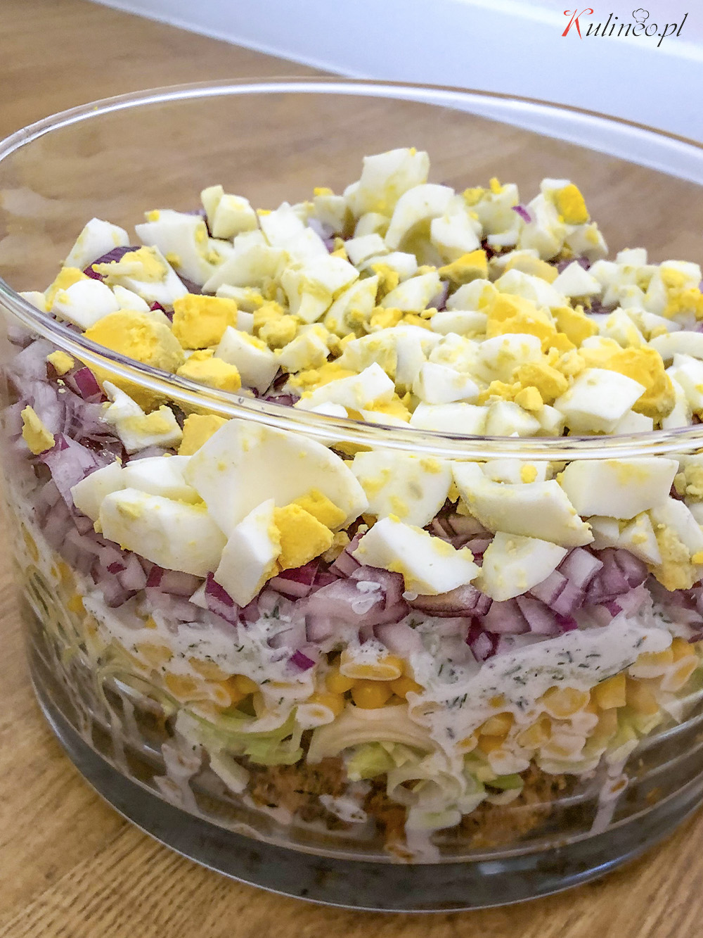Pyszna sałatka warstwowa z kurczakiem i sosem koperkowym. Idealna na święta, domowe imprezy i inne nadarzające się w ciągu roku okazje.