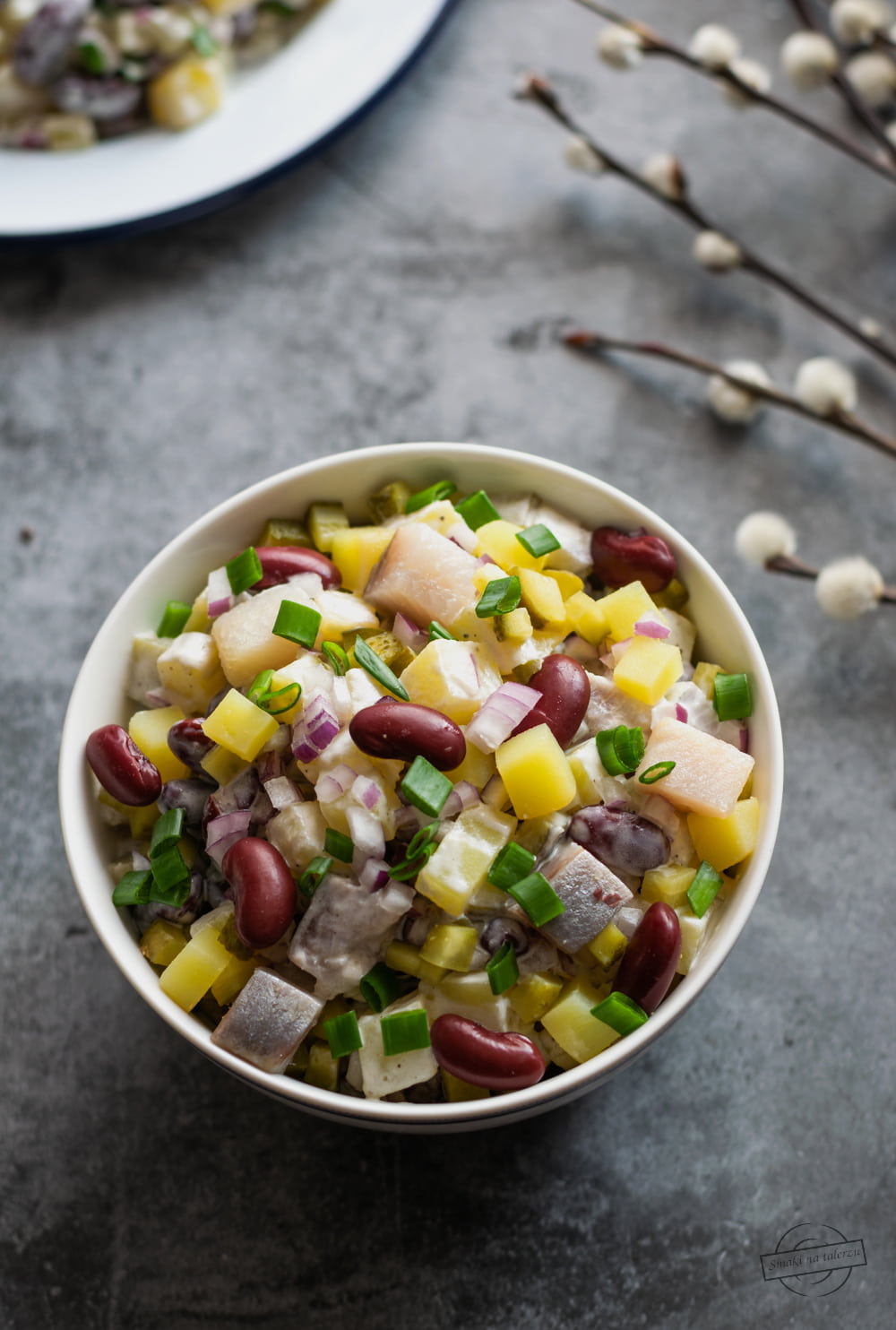 Smaczna i sycąca sałatka śledziowa, to propozycja np na kolację ale też i na Święta. Mamy tutaj śledzie, ziemniaki, czerwoną fasolę oraz ogórki konserwowe.