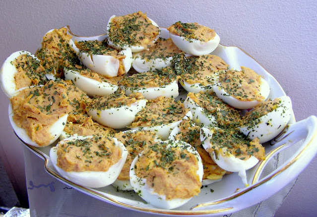 Każde jajko przeciąć na połowę, delikatnie wyjmować żółtka do miski.