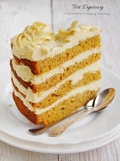 …wilgotne i aromatyczne ciasto dyniowe przekładane kremem z kaszy manny. Tort jest…