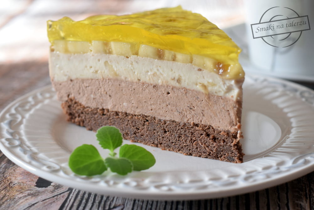 Dziś zapraszam na jedno z moich ulubionych połączeń smakowych. Czekoladowo-bananowy serniczek na zimno, bo o nim mowa, to ciasto podwójnie czekoladowe i podwójnie bananowe;) Spód bowiem stanowi mocno czekoladowe/kakaowe ciasto murzynkowe, na nim mamy czekoladową warstwę sorewą. Powyżej serowo-bananowa pianka, zaś na wierzchu plasterki bananów przykryte galaretką.