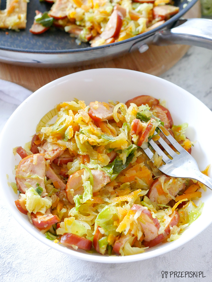 Młoda kapusta duszona z kiełbasą to bardzo proste w przygotowaniu danie,