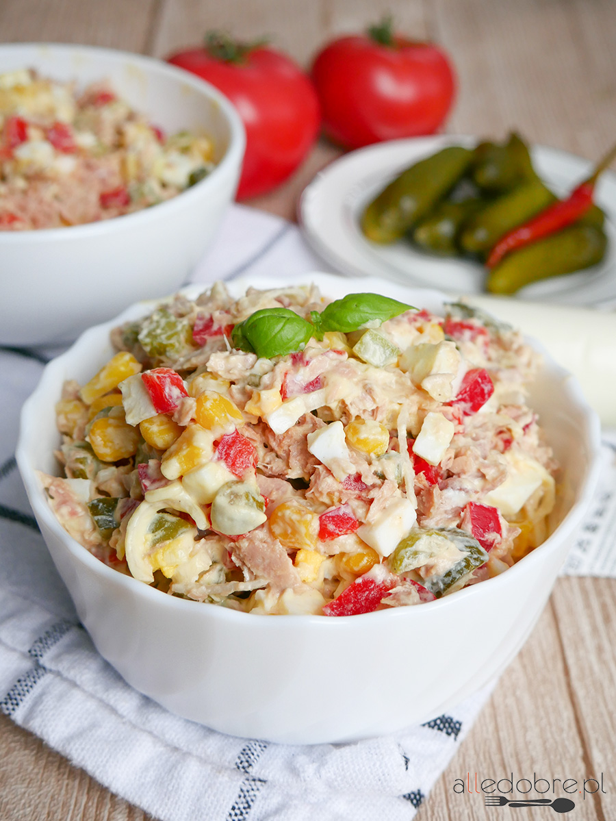 Szukasz pomysłu na dobrą sałatkę? Dziś mam dla Ciebie przepis na pyszną sałatkę z tuńczykiem z puszki, którą z powodzeniem możesz przygotować na lekki obiad czy kolację. Oprócz tuńczyka w sałatce znajdziesz jeszcze takie składniki jak jajka, paprykę czerwoną, kukurydzę, ogórki konserwowe oraz pora. Do tego prosty i smaczny sos