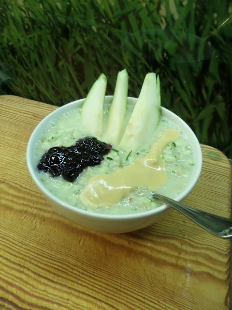 owsianka cukiniowo-gruszkowa na mleku sojowym z kardamonem, podana z gruszką, dżemem z…