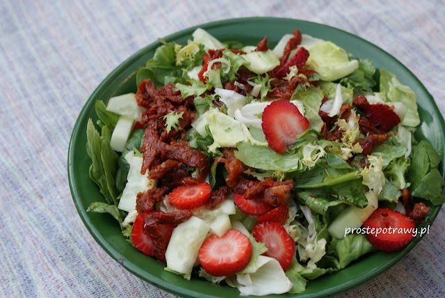 Przygotowanie:Truskawki pokroić w plastry, ogórki w półplasterkiPomidory rozdrobnićDo mix sałat dodać powyższe składnikiWymieszać i polać sosem z musztardy, cytryny oliwy