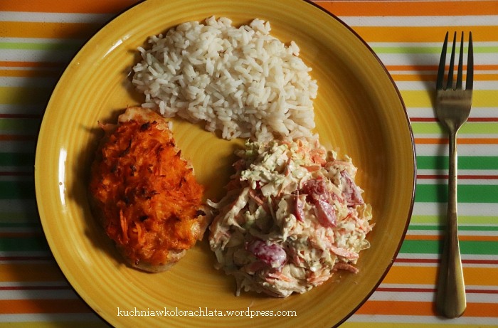 Chrupiąca, smaczna i prosta surówka z młodej kapusty z dodatkiem jabłka, marchewki, selera naciowego i cebuli.
