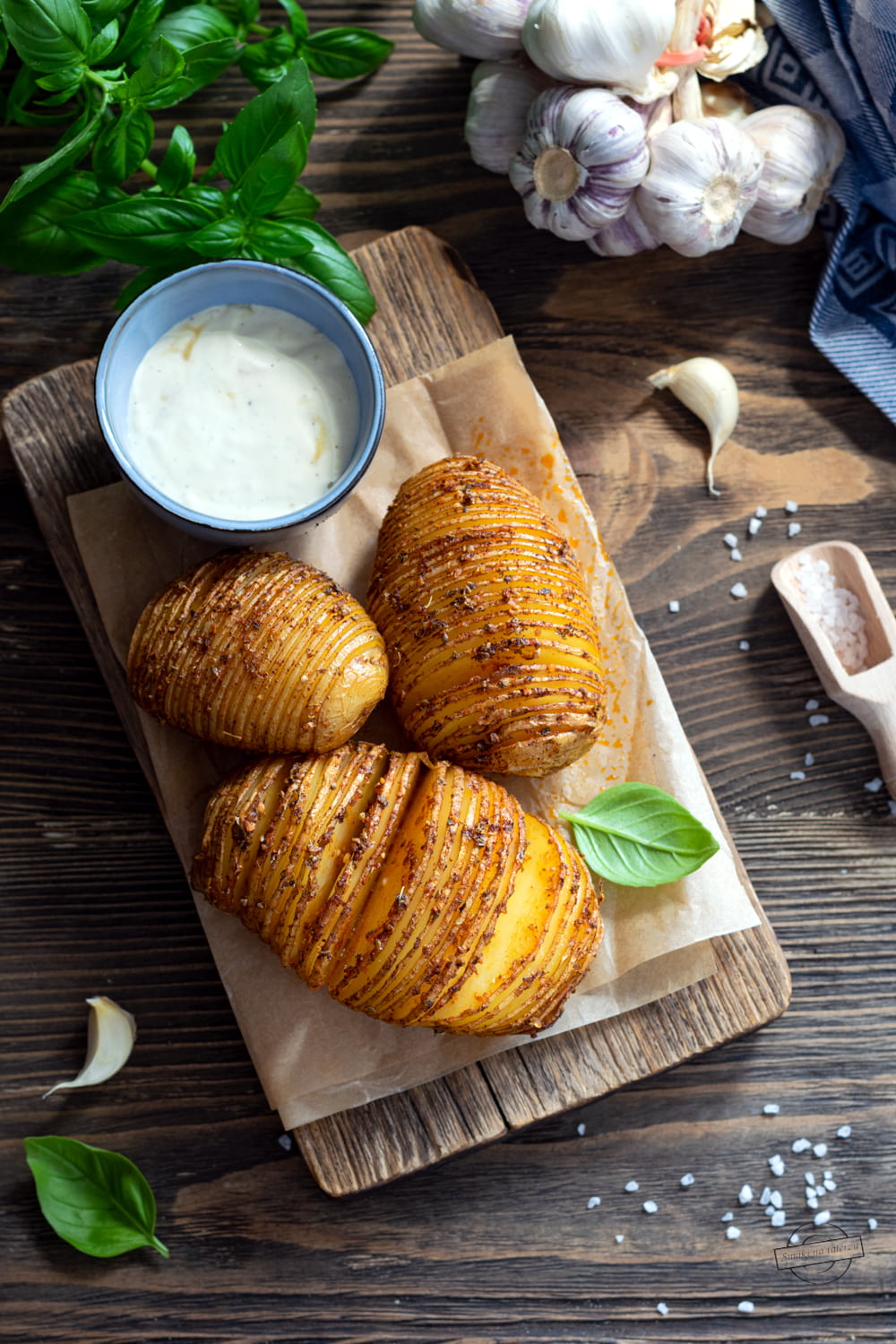 Ziemniaki Hasselback to świetny sposób na podanie pieczonych ziemniaków w niecodziennej formie. Ziemniaki przed pieczeniem nacina