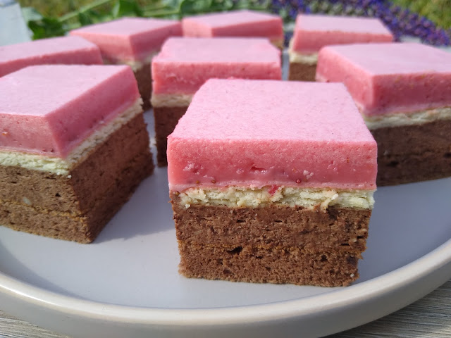 Polecam proste ciasto z masami: czekoladową i truskawkową. Masa czekoladowa składa się z mascarpone i śmietanki oraz czekolady. Dodałam czekoladę gorzką ale można dodać inną dowolną, taką jaką lubimy. Masa truskawkowa to zmiksowane truskawki z galaretką i ubitą śmietanką.