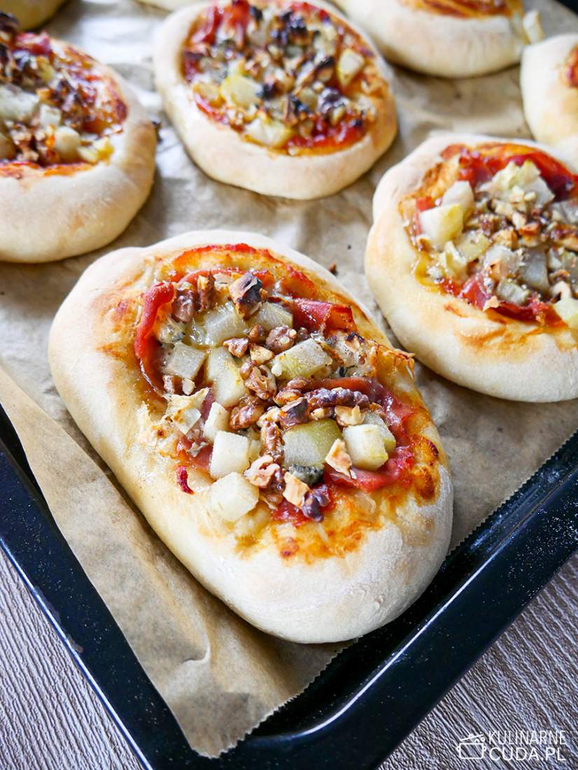 Przepis na bardzo dobre mini pizze. Puszyste i chrupiące ciasto oraz pyszne dodatki.