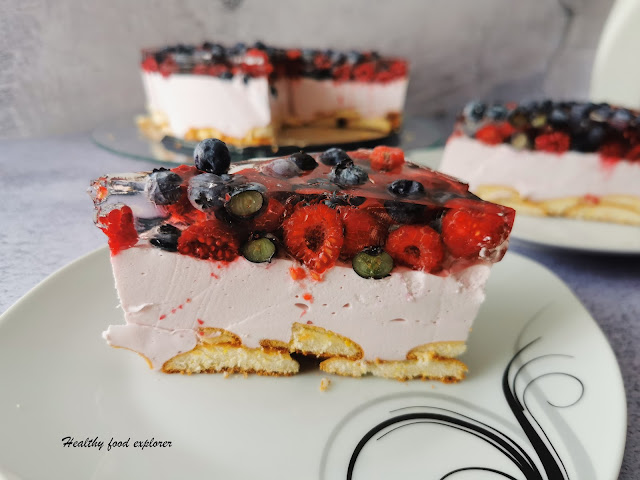 Pyszne, bardzo proste ciasto na zimno z mnóstwem sezonowych owoców. Lekkie i orzeźwiające, idealne na lato. Do zagęszczenia krem użyłam galaretki o smaku jagodowym, ale sprawdzi się też malinowa, czy truskawkowa. Natomiast na wierzch wybrałam galaretkę krystaliczną dzięki czemu owoce fajnie się prezentują. Do przygotowania ciasta nie użyłam dodatkowego
