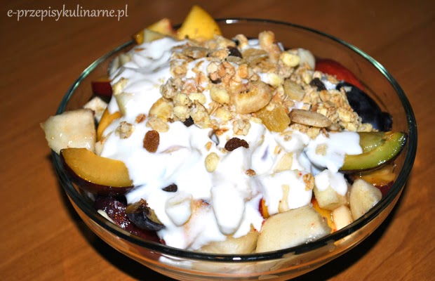 Składniki: jabłkobrzoskwiniakilka śliwekkubeczek jogurtu naturalnegocukier pudergarść crunchówgarść suszonych owoców: rodzynki, jabłka, banany…