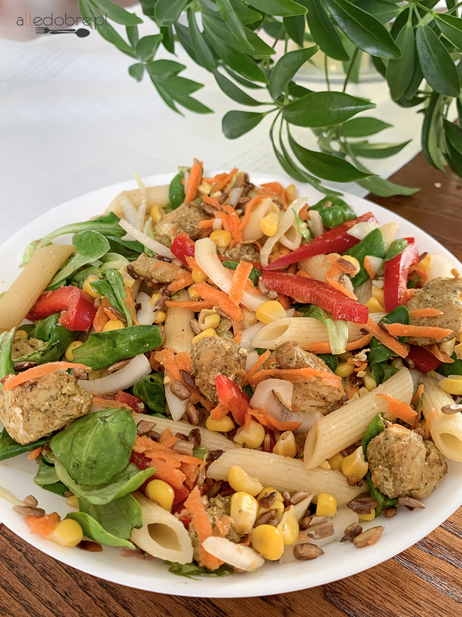 Pyszna i kolorowa sałatka z kurczakiem. Prosta w przygotowaniu, pożywna i smaczna. Tę sałatkę bardzo często zabieram ze sobą do pracy, szykuję na kolację, a także serwuję podczas rodzinnych spotkań.