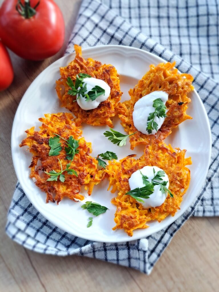 Aromatyczne placki z batatów z dodatkiem cebuli, czosnku, mąki i jajek to pyszna propozycja na ciepłe śniadanie, obiad i kolację. Doprawione kurkumą i gałką muszkatołową. Podasz je z jogurtem i pomidorami bądź w wersji obiadowej z warzywnym sosem. Chrupiące i proste w przygotowaniu. Placki warzywne, które smakują na ciepło i
