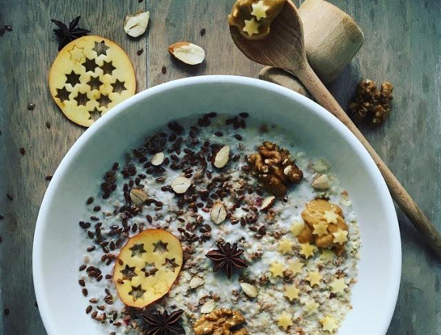 kasza jaglana + mleko kokosowe + migdały + orzechy + jabłka + masło orzechowe + siemię lniane