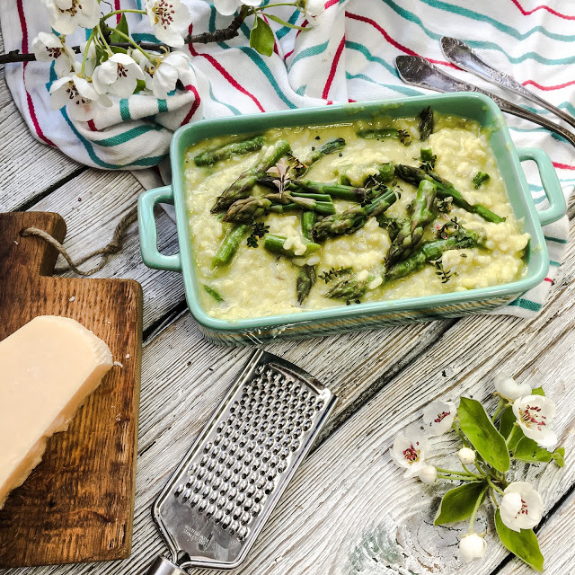 Zielone i bardzo szparagowe risotto, naszpikowane umami. Kremowy ryż ugotowany z wywarem…