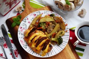 Przepis wypatrzony kiedyś na stronie cincin. Bardzo dobry i niezbyt wymagający. Wystarczy pokroić pieczarki i przygotować mięso, a następnie je zapiec.