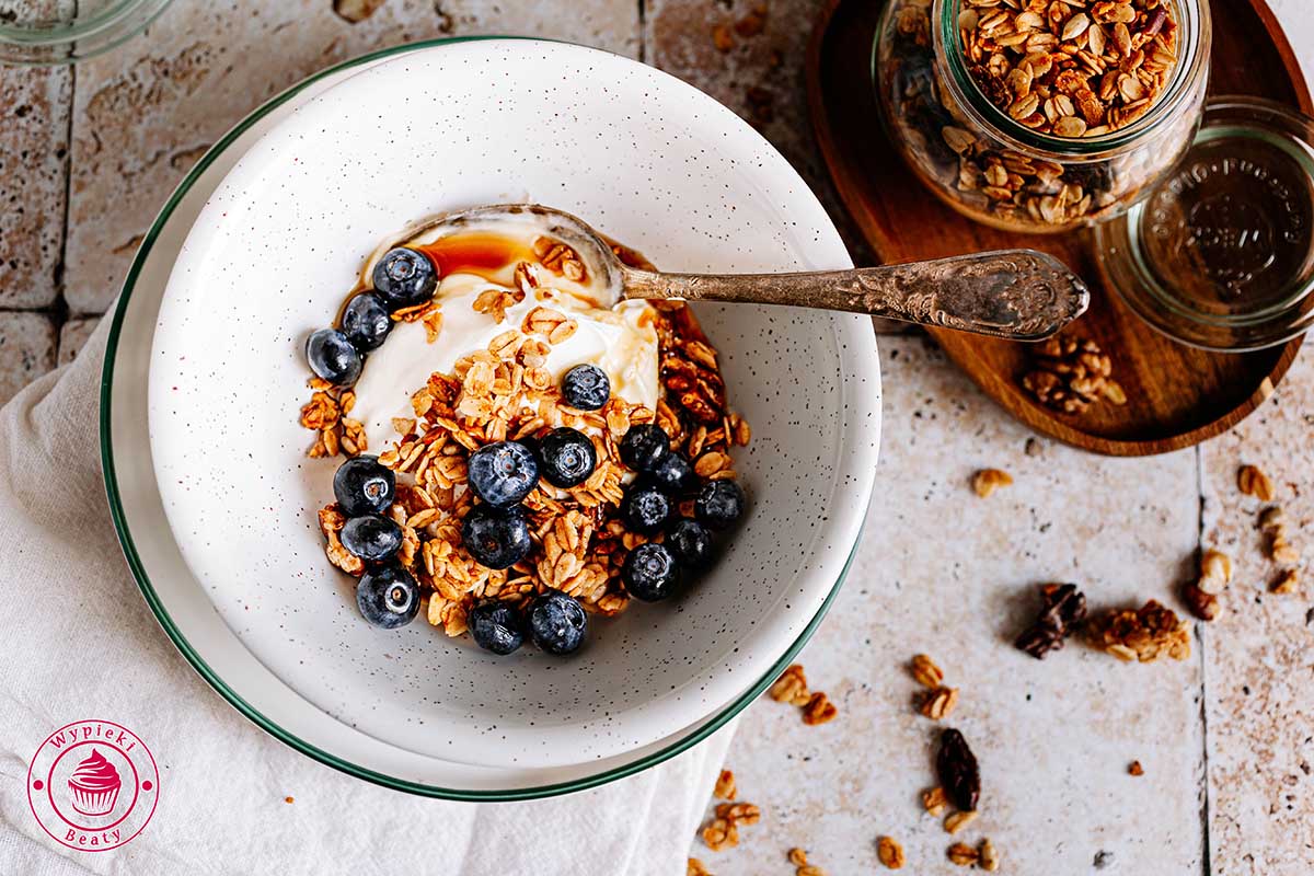 Dziś na śniadanie poleca się zdrowa chrupiąca granola. Taka domowa granola pełna najlepszych składników, to doskonały pomysł na szybkie i do tego zdrowe śniadanie. Ja zrobiłam sobie wegańską granolę z orzechami pekan i włoskimi oraz z pestkami dyni. Do tego odrobina słodkich