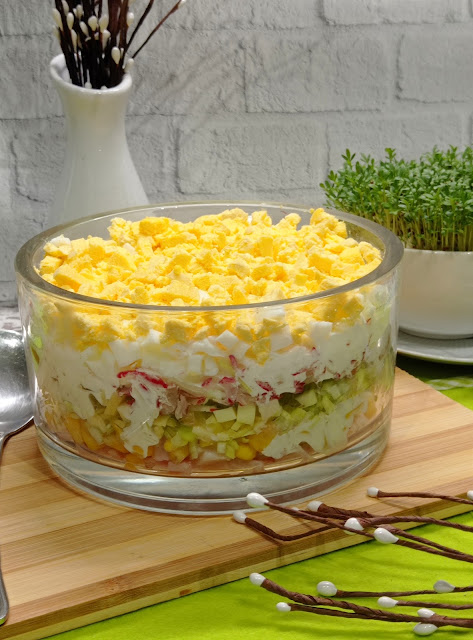 Pyszna sałatka warstwowa z szynką i żółtym serem. Na różnego rodzaje uroczystości,…