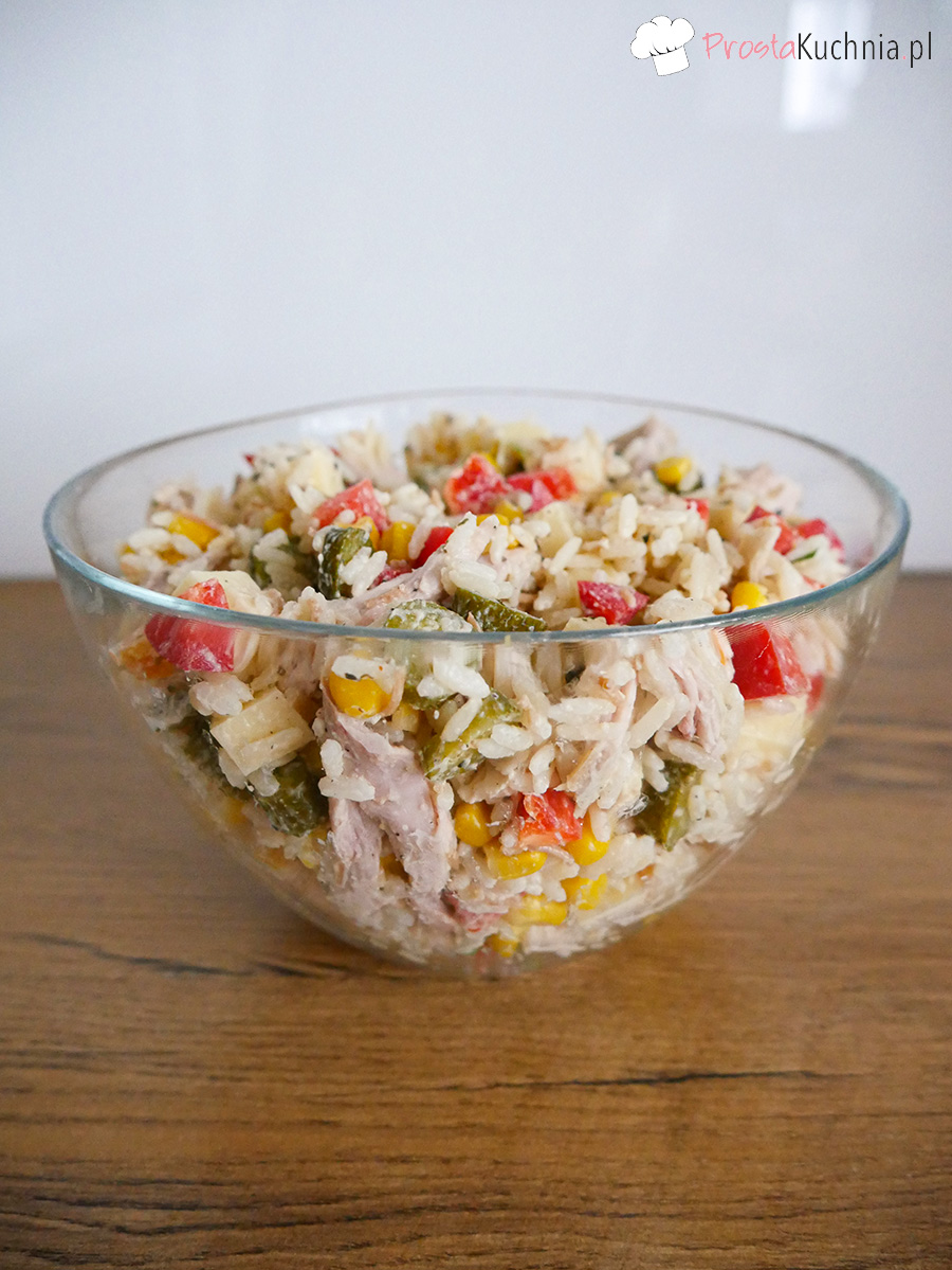 Pyszna sałatka z makaronem orzo, kurczakiem i suszonymi pomidorami, oliwkami i grana…