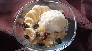 2 1/2 szklanki mleka1/2 szklanki ziemnej wody 6 łyżek płatków owsianych 1 banan 1 gałka ulubionych lodów1 łyżeczka rodzynek1 łyżeczka migdałów