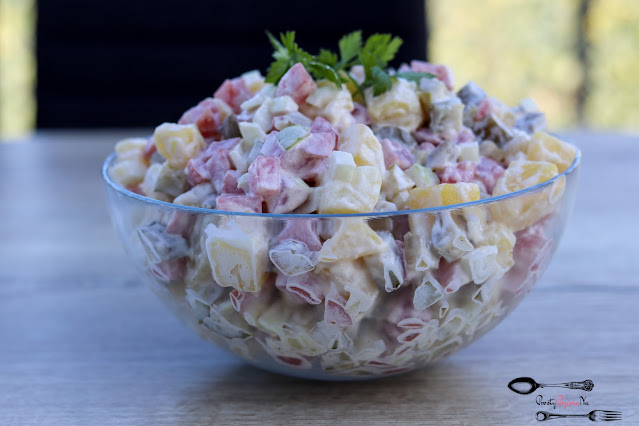 Zaserwowałam tę sałatkę na urodzinach córki – zniknęła ze stołu raz dwa. Inna niż tradycyjne, więc każdy z ciekawości próbował i okazało się, że jest bardzo smaczna. 🙂