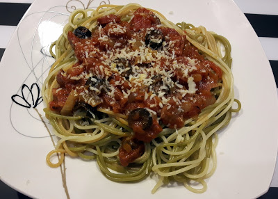 SPAGHETTI Z OLIWKAMI I CHORIZO