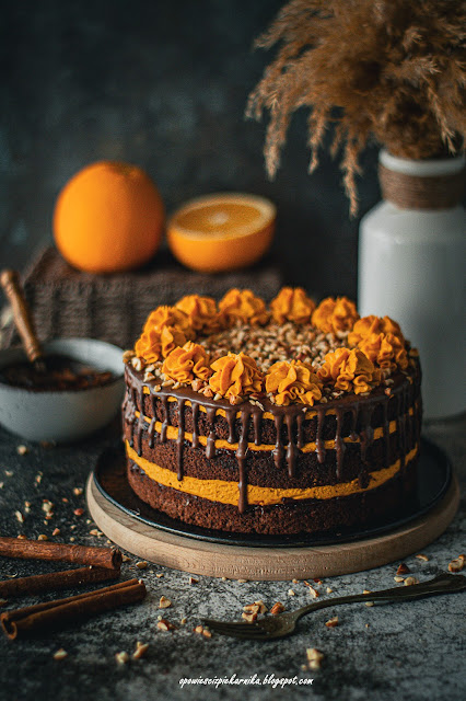 Ach co to był za tort! Wspaniałe połączenie wielu smaków 😀 Kakaowe blaty puszystego biszkoptu nasączone świeżo wyciśniętym sokiem z pomarańczy, dyniowy krem z cynamonem, powidła śliwkowe, polewa czekoladowa i uprażone orzechy laskowe – to wszystko w jednym wypieku! 🙂 Czy było pysznie? Tak! Choć nie każdemu „podejdzie” ten