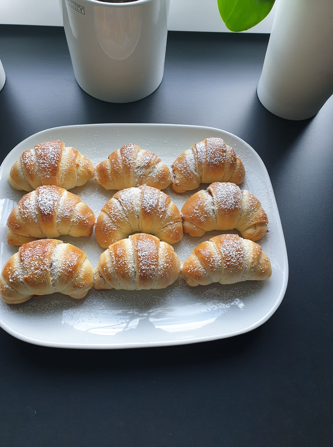 Miękkie i pachnące rogaliki z nadzieniem różanym. Najlepiej smakują jeszcze lekko ciepłe po wyjęciu z piekarnika.