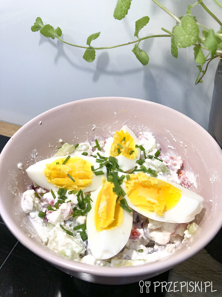 Składniki: 4 jajka 100 g krewetek 1 łyżka majonezu 1 łyżka serka…