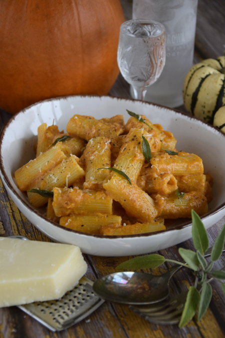 Nie żadne alla vodka ale po prostu makaron z wódeczką, w prostym tłumaczeniu. Jest to makaronowy klasyk, z dobrego rodzaju koncentratu pomidorowego, na szybko, z naszym wspaniałym wyskokowym trunkiem. I nie wiem czy to procentowy dodatek sprawia, ale danie jest nieziemsko pyszne. W jesiennym wydaniu zdecydowałam się dodać dynię