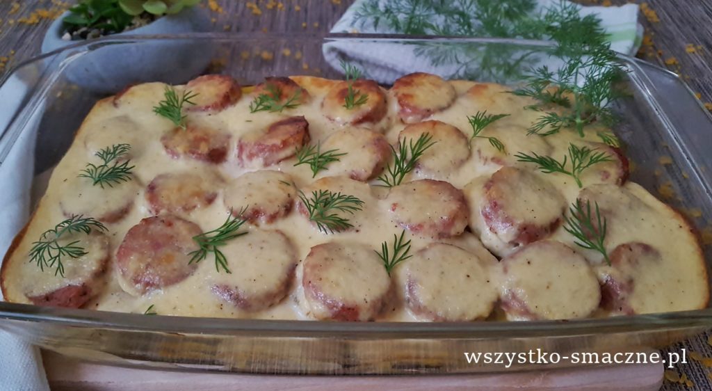 Zapiekanka ziemniaczana z białą kiełbasą i sosem chrzanowym Zapiekanka ziemniaczana z białą…