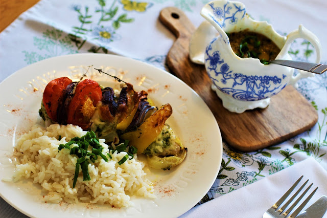 Faszerowane piersi z kurczaka w sosie z pieczonych warzyw / Stuffed chicken breasts in a roasted vegetable sauce.