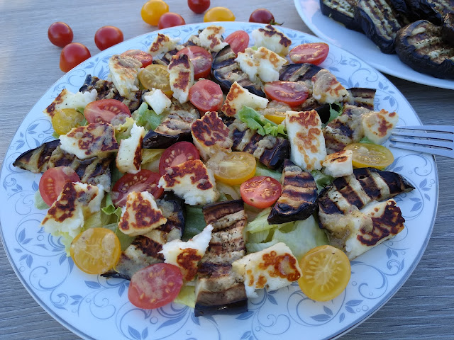 Znowu mam dla Was przepis na pyszna sałatkę z bakłażanem. Tym razem kompozycja z pomidorkami i serem halluomi. Polecam pyszna 🙂