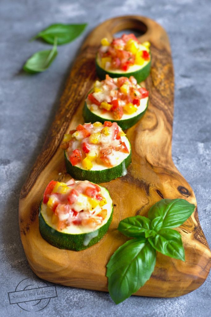 Plasterki cukinii z drobno posiekaną czerwoną i żółtą papryką, pomidorem i cebulą,…